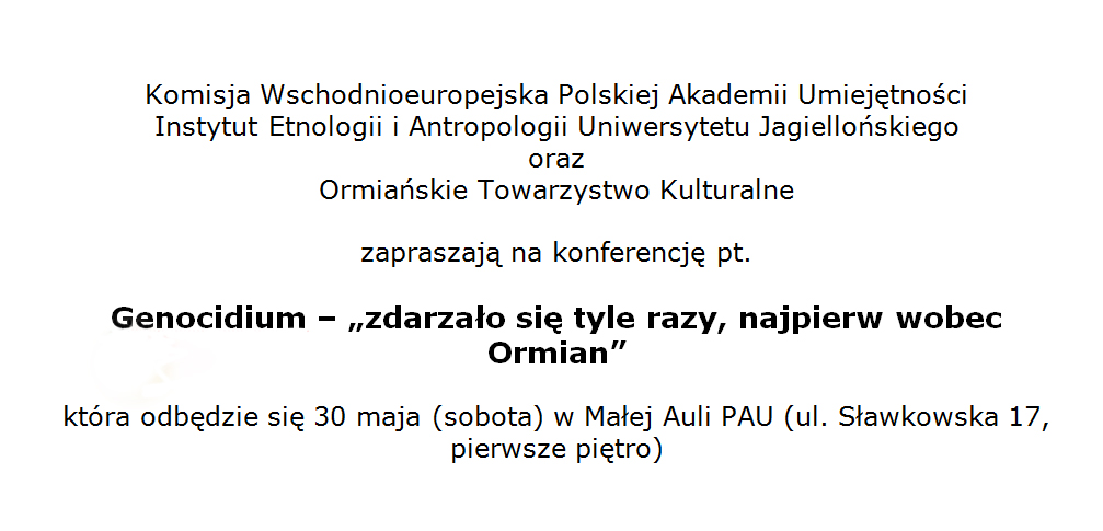 godz. 13.45 – dyskusja panelowa pt. Kulturowe konsekwencje ludobójstwa Ormian w aspekcie historycznym i współczesnym, udział wezmą: dr Renata Król Mazur (Kraków), dr Dorota Ziętek (Kraków), dr hab. Andrzej A. Zięba (Kraków), dr Jakub Osiecki (Kraków), Konrad Siekierski (Warszawa)