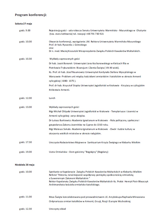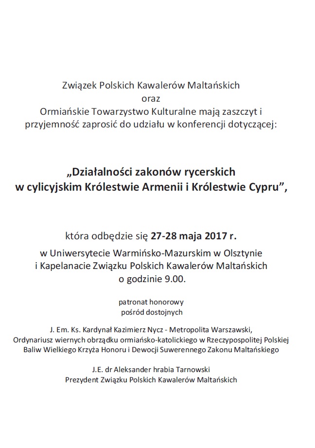 Związek Polskich Kawalerów Maltańskich oraz Ormiańskie Towarzystwo Kulturalne mają zaszczyt i przyjemność zaprosić do udziału w konferencji dotyczącej „Działalności zakonów rycerskich w cylicyjskim Królestwie Armenii i Królestwie Cypru”, która odbędzie się 27-28 maja 2017 r. na Uniwersytecie Warmińsko-Mazurskim w Olsztynie oraz Kapelanacie Związku Polskich Kawalerów Maltańskich w Klebarku Wielkim.